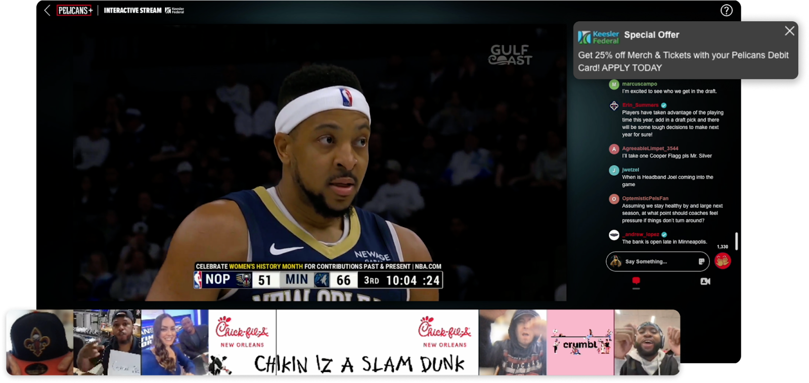 The Pelicans recently launched their first-ever interactive live game stream, presented by Keesler Federal Credit Union, and it proved to be a significant hit with the fan base. The stream featured a dynamic mix of chats, cheers, polls, and fan-submitted videos, creating a highly engaging experience.