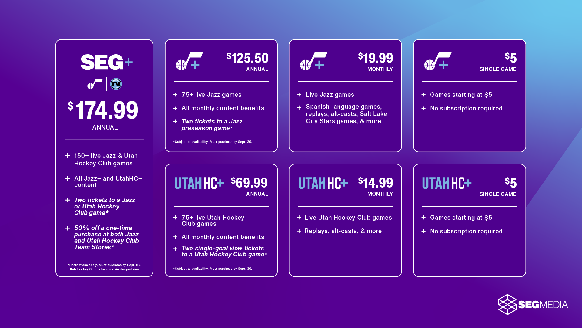 Subscriptions to SEG+, UtahHC+, and Jazz+ are available for purchase now at www.segplus.com. Only annual and monthly subscriptions include access to on-demand games and other content such as alt-casts, in addition to live games.